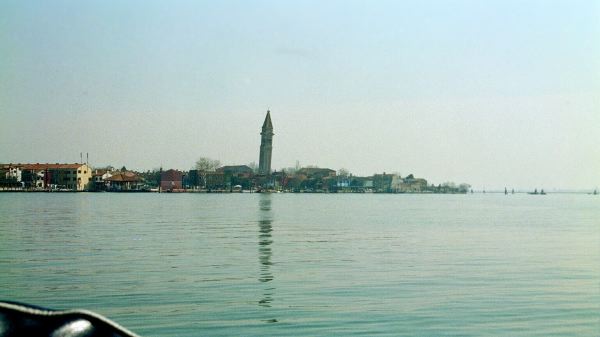 Approaching the island of Borono and its leaning bell tower. Borono is about a mile from Borono and about 4 miles from Venice in the Adriatic.