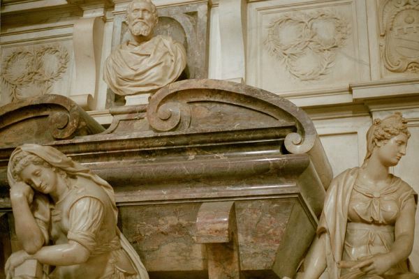 Michelangelo Buonarrati's tomb. Notice how Vasari gave the statues faces of profound sadness emphasizing the great loss to humanity in Michelangelo's death.