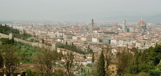 This wider view of Florence includes the city wall. The history of the city goes back to Roman times when Julius Caeser rewarded loyal veterans of the army with plots of fertile land along the Arno River. The original plot distribution can still be seen in how the central part of the city is broken up into blocks. The city grew and by the 3rd century had become an important trade center being at a crossroads in trading routes from north to south and east to west. Unlike many medieval cities, Florence was not completely walled. As a City-State Florence had many years of peace but as you can see from this angle there was a significant wall built that runs from Fort Belvedere to the river. Italy was not a country until the late 1800s--only a region. Florence was one of many City-States, a country with its own political system. For over 200 years, from the late Middle Ages until the 1700s, Florence was ruled almost continuosly by The De' Medici Family. Their appreciation for arts and music started the Humanist movement and its revivle of ancient and classic knowledge gave the world the renaissance. As you will read, the family's influence is still felt today in this busy and vibrant city.