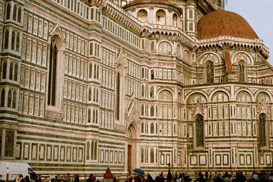 West wall of the Duomo Santa Maria Della Fiore. Side walls of the church continue the same marble patterns and motifs throughout and around the structure.